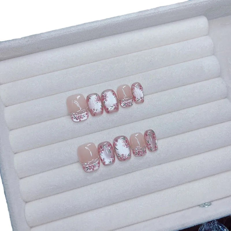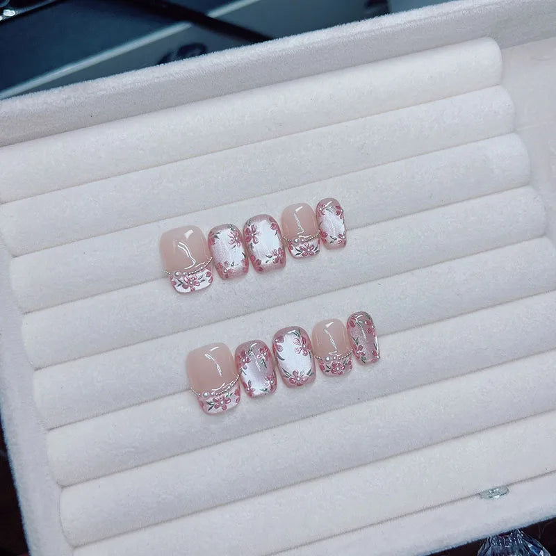 10Pcs Handmade Press on Nails Short Oval Flowers Blooming Pearl Chain False Nail for Women&Girl Removable Wearable Nail Art