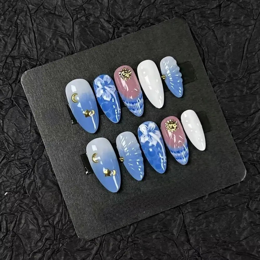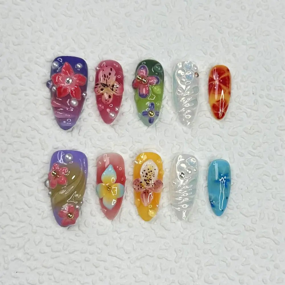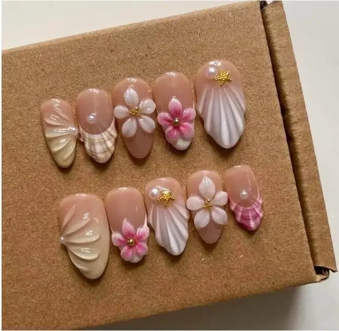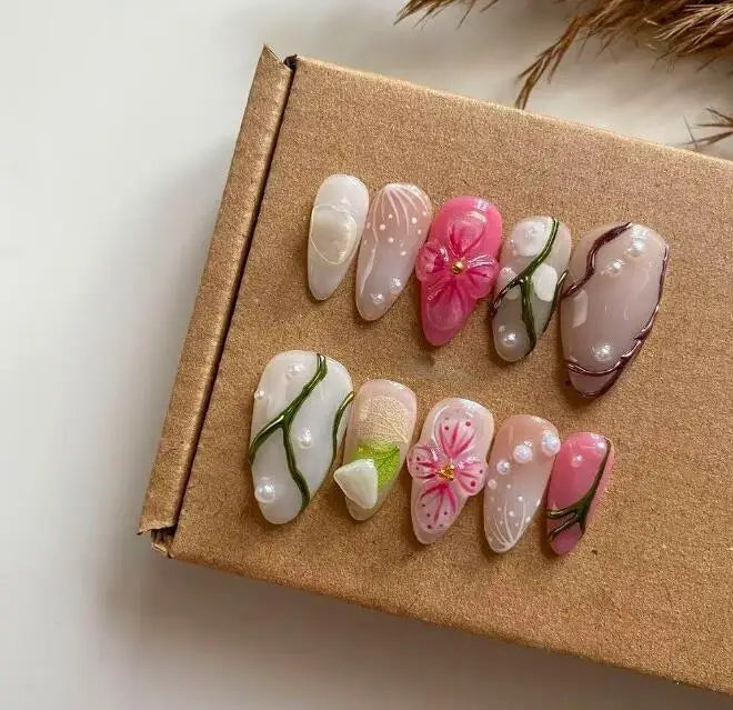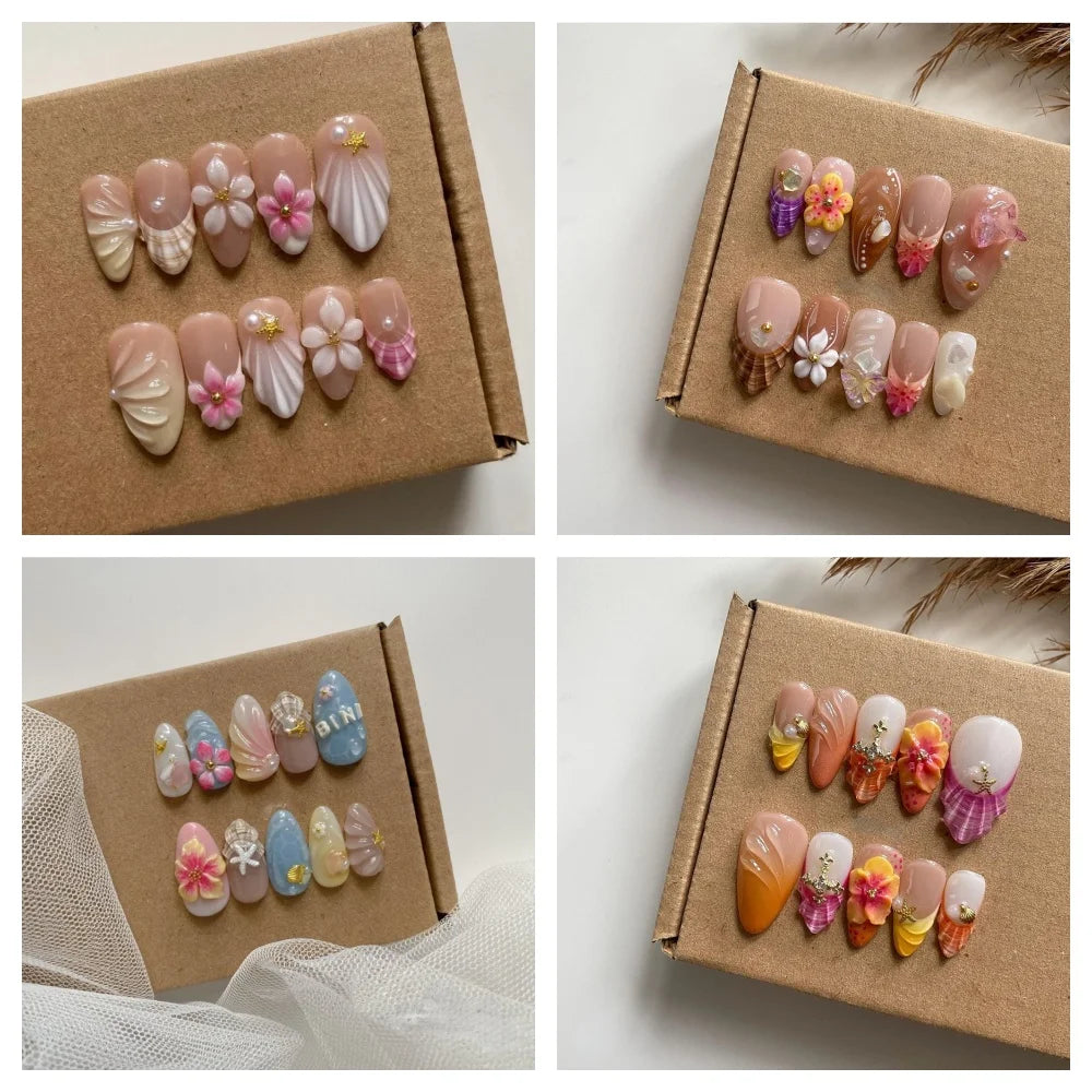 10Pcs Manicure Handmade Art Acyrlic Press on Nails Medium Almond Pattern ABS Nails Cute 3D Flower Style Design Nail with Set