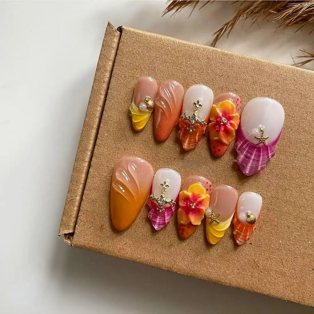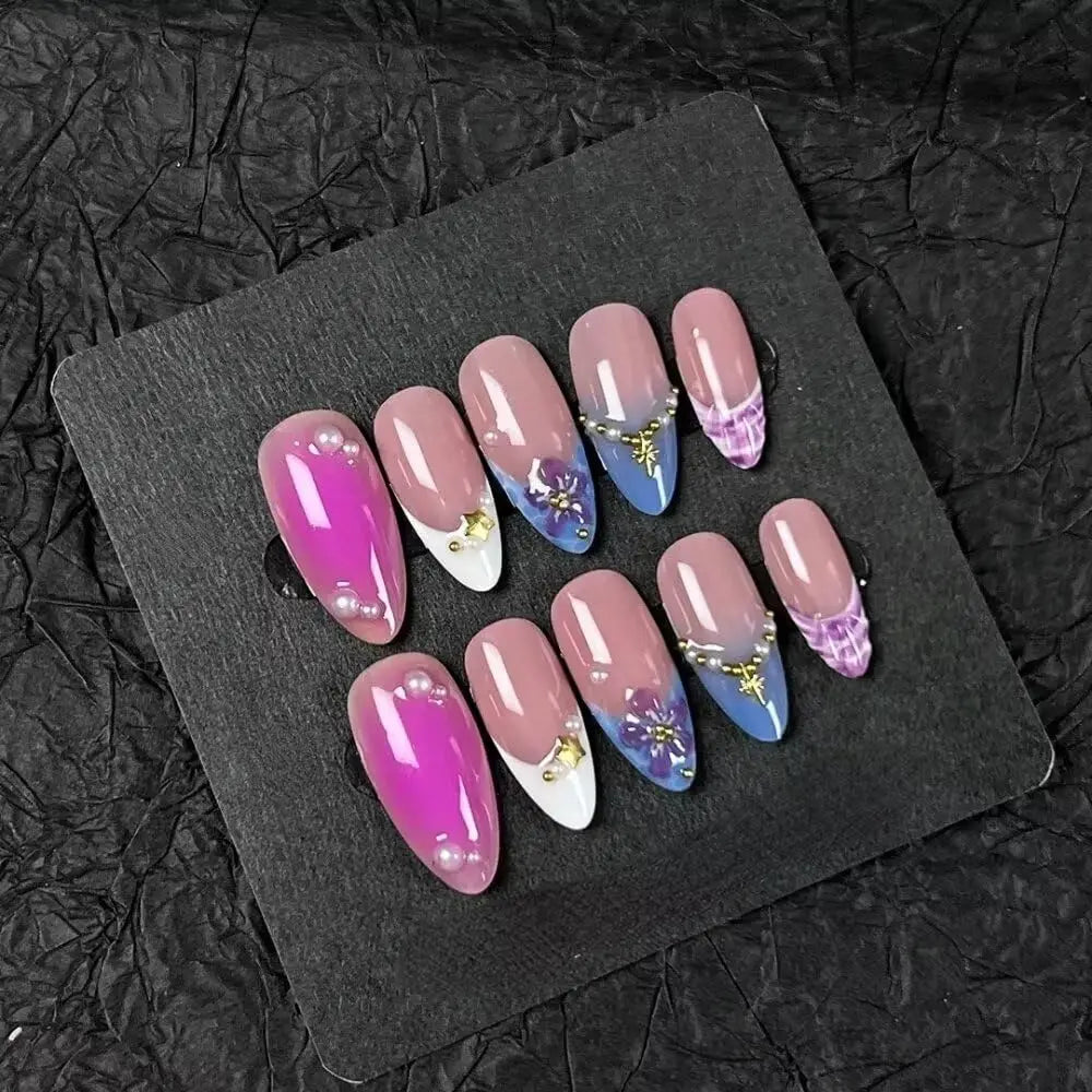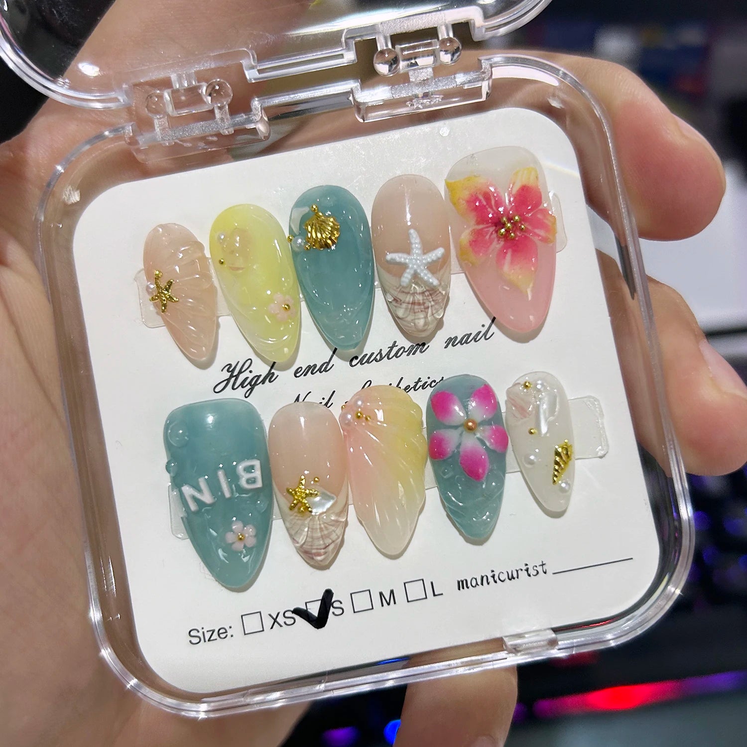 10Pcs Manicure Handmade Art Acyrlic Press on Nails Medium Almond Pattern ABS Nails Cute 3D Flower Style Design Nail with Set